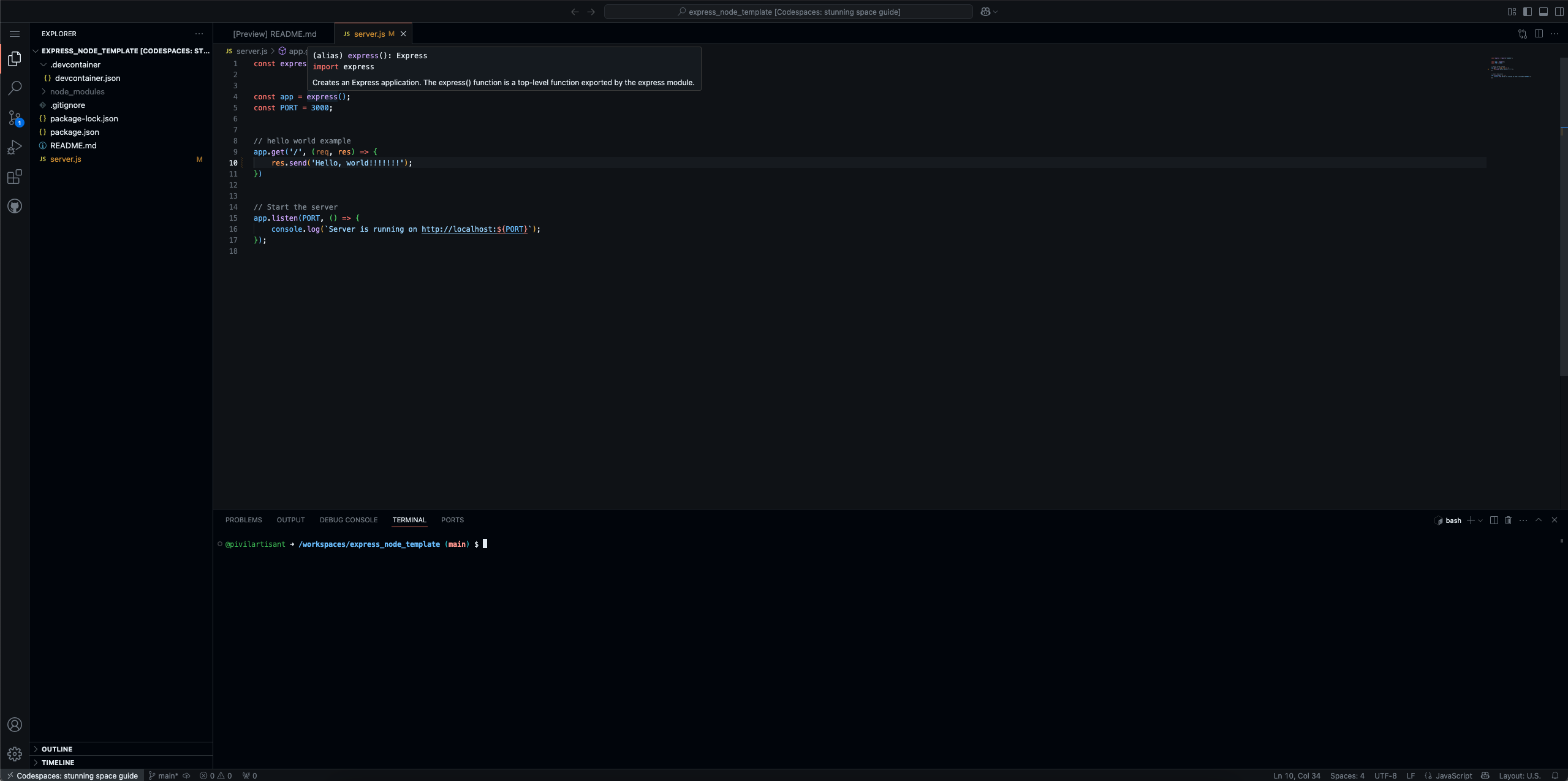 To start using Node.js in a codespace, navigate to this repo and follow the instructions in the readMe.